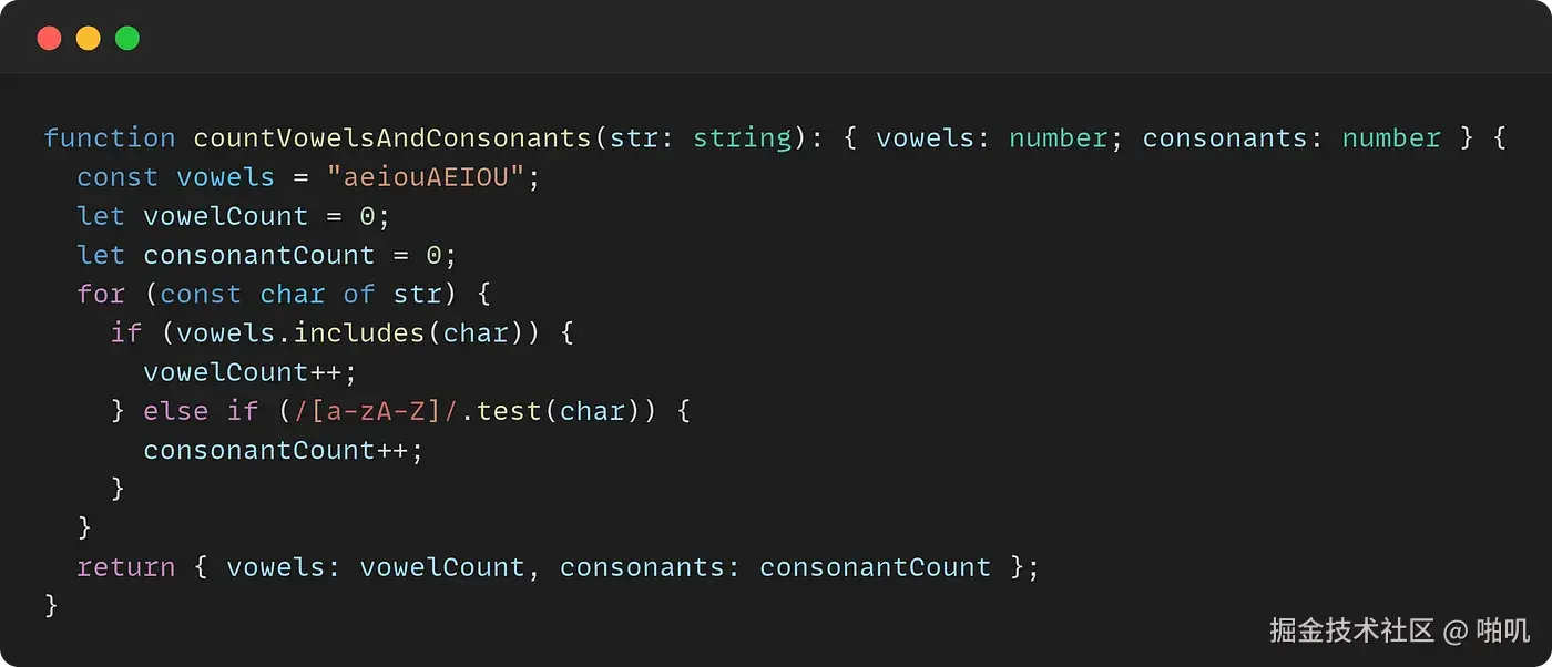 问题:“创建一个函数,统计一个字符串中的元音和辅音的数量。”