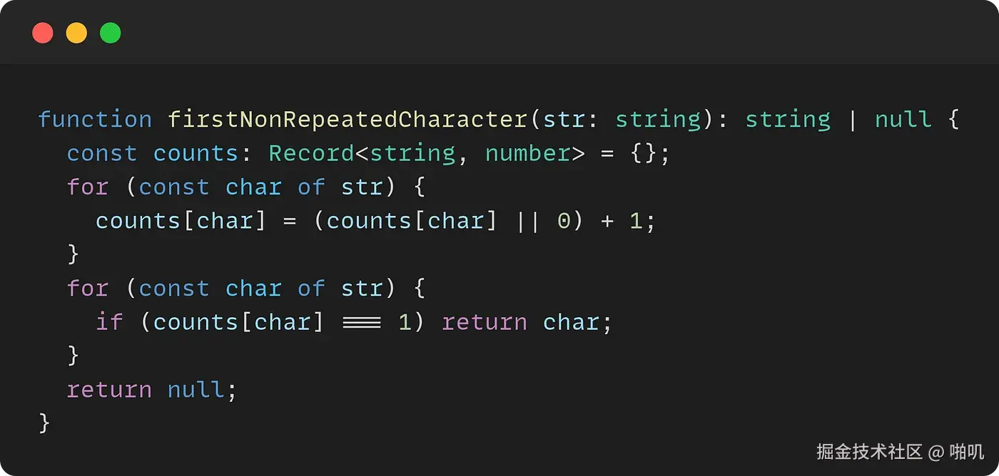 问题:“实现一个函数,找到字符串中的第一个不重复的字符。”