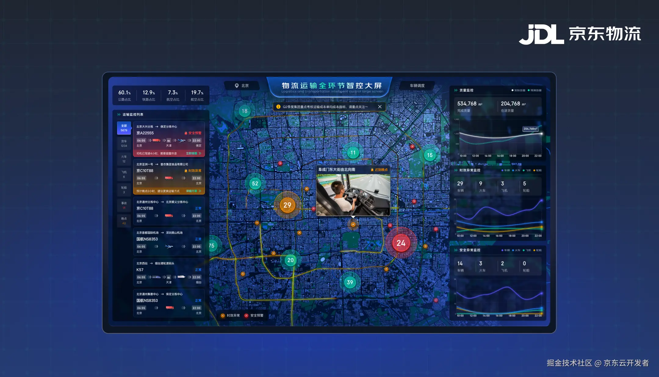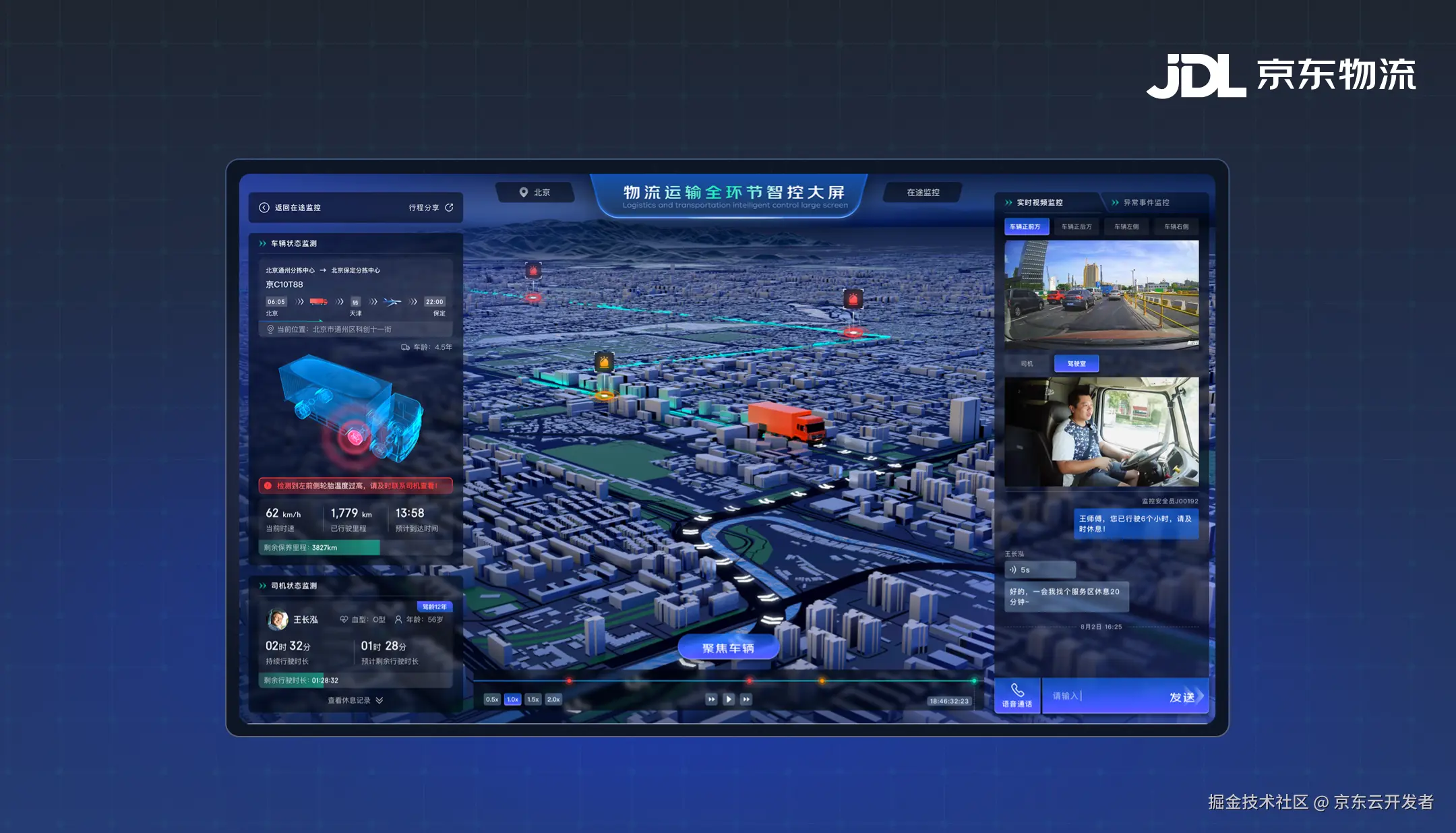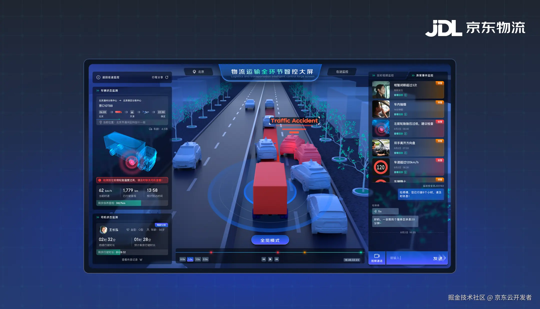 使用信息可视化实时监控货、车、线的动态分布,提高在途场景数据透明度,使调度员能够掌控全局。通过联动 ADAS、GPS、车轮毂测温等车载硬件设备,智能识别异常事件并触发警报,帮助前置干预降低事故发生率,为运输安全、时效履约保驾护航。