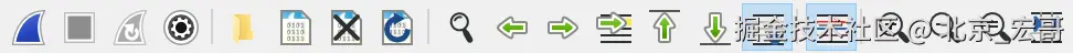 主菜单工具栏:简单来说,Toolbar 实际上是一组最常用的主菜单项的快捷方式。熟悉 Wireshark 后,您会很快记住哪个图标用于什么用途。工具栏中的项目被启用前或禁用显示为灰色,类似于其相应的菜单项。例如,下图中显示了打开文件后的主窗口工具栏,启用了各种与文件相关的按钮,但是由于未进行捕获,因此禁用了 “停止捕获” 按钮。如下图所示: