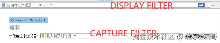 过滤工具: 有两个过滤器工具栏:显示过滤器和捕获过滤器。两者之间有区别,但是两者都用于简化您的数据包搜索。如下图所示: