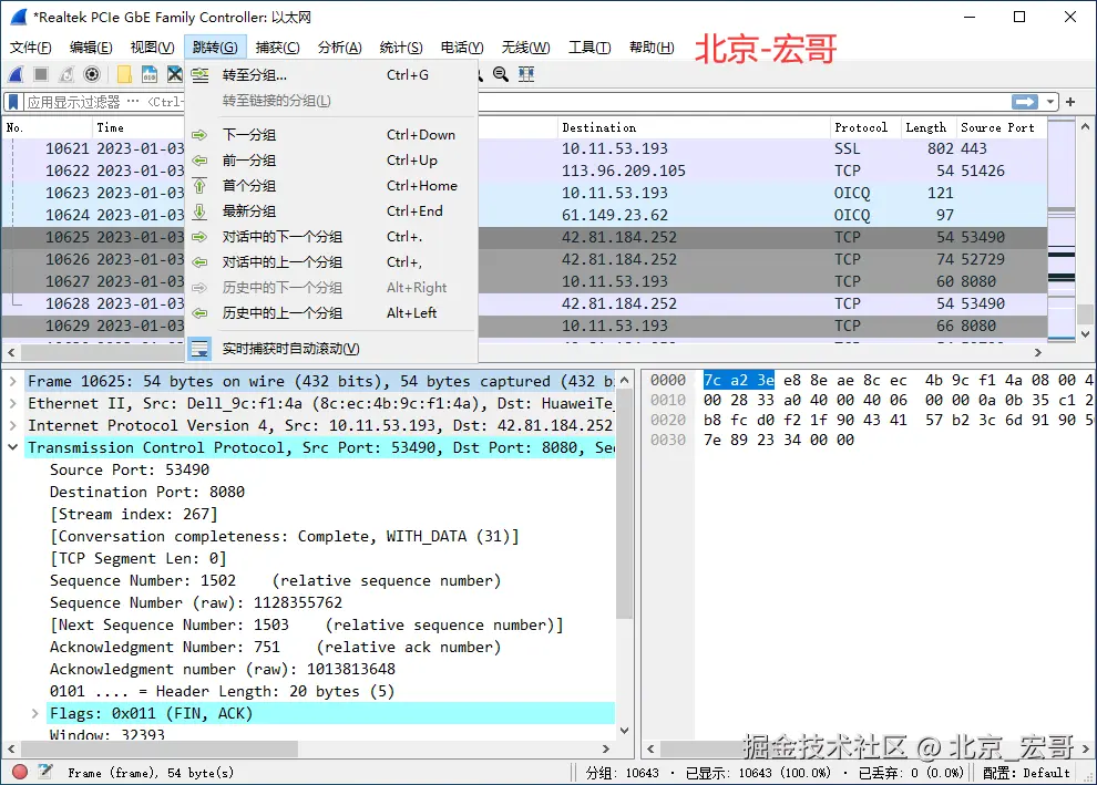 “跳转”栏的英文是“Go”,该菜单主要用来跳转到指定数据包。很少用到,一般都是快捷方式。这实际上是一个数据包管理菜单。您可以使用它来遍历捕获数据包。“下一个数据包”和“上一个数据包”按钮可用于导航屏幕上的显示数据,当然,您可以简单地使用“Ctrl + 上/下”按钮或鼠标滚动来更轻松地进行遍历。如下图所示: