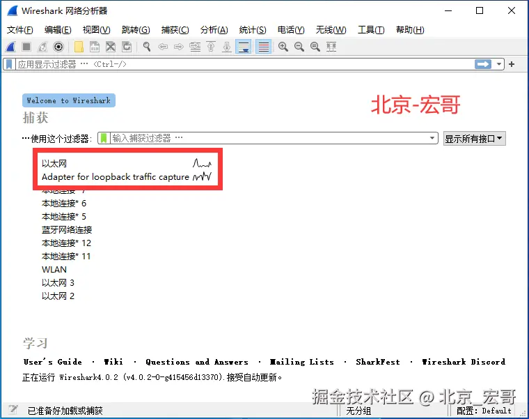 首次打开启动 Wireshark 时,会出现以下启动界面,如下图所示:
