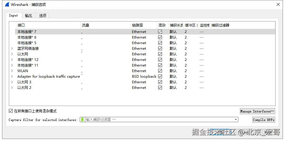 2.捕获过滤,这里输入过滤表达式,可以只抓取特定的包,如果没有表达式,所有监听到的包都抓到下来。
