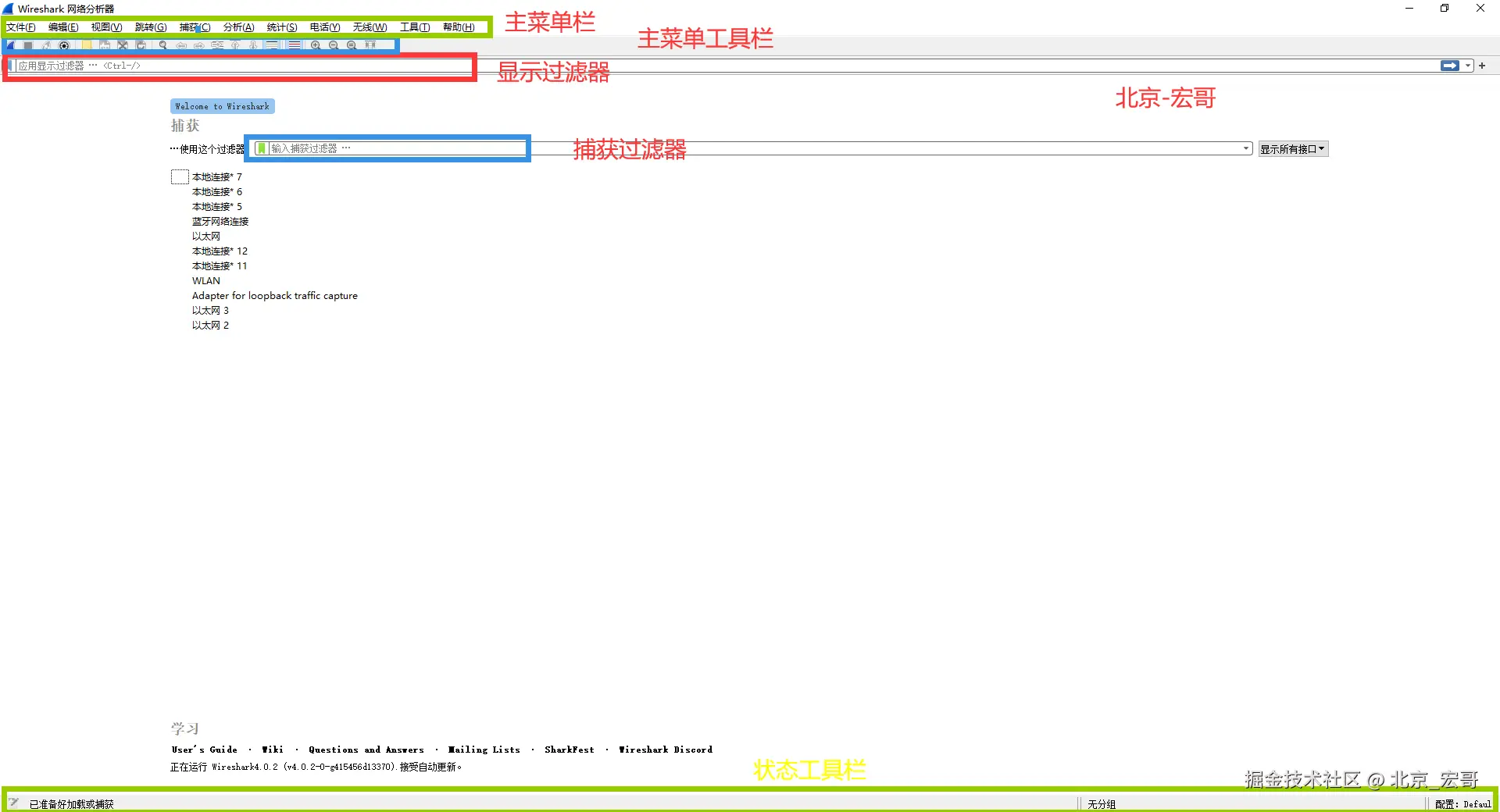 由上到下依次是标题栏、主菜单栏、主菜单工具栏、显示过滤文本框、打开区、最近捕获并保存的文件、捕获区、捕获过滤文本框、本机所有网络接口、学习区及用户指南等。