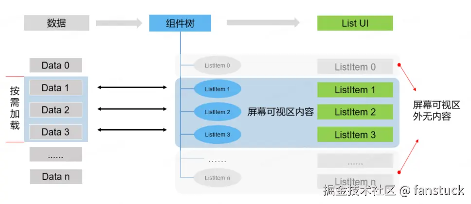 - 根据加载的数据量创建组件,挂载在组件树上,屏幕可以展示多少列表项组件,就按需创建多少个ListItem组件节点挂载在List组件树根节点上。