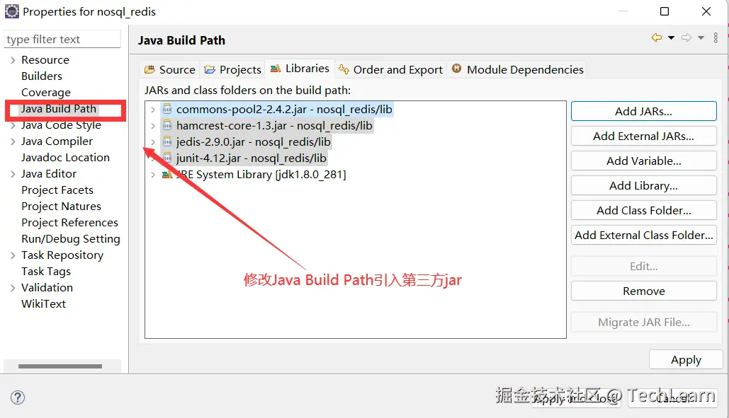 二、新建lib包,放入第三方redis依赖包:jedis-2.9.0.jar、commons-pool2-2.4.2.jar、hamcrest-core-1.3.jar、junit-4.12.jar