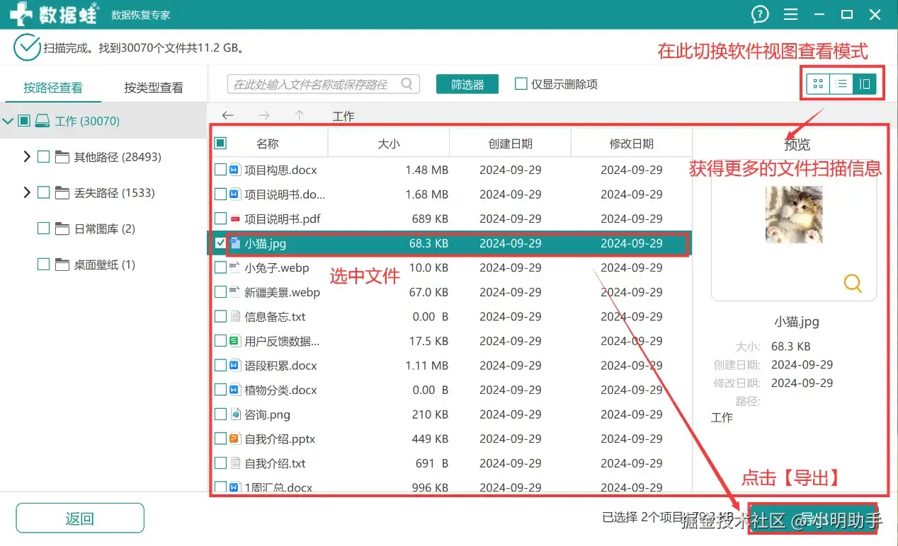 第2步:耐心等待扫描结束后,选择需要进行恢复的文件,然后点击右下角的【导出】。