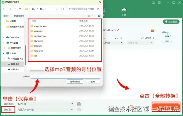 步骤3:完成格式选择后,单击【保存至】选择mp3音频的导出位置,然后再点击【全部转换】按钮即可。