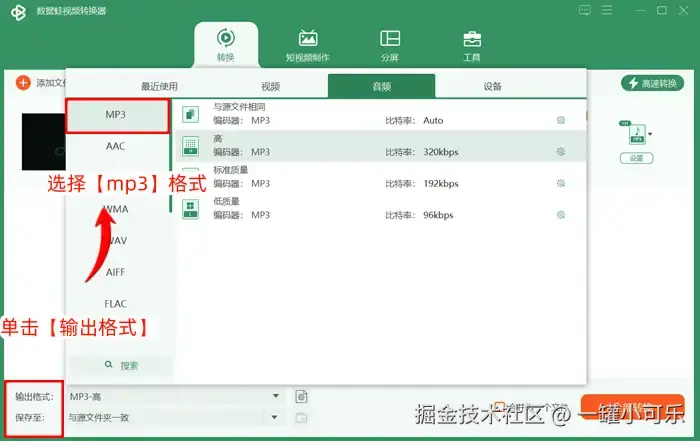 步骤2:单击【输出格式】选择输出kgm音频的输出格式,选择【mp3】格式。