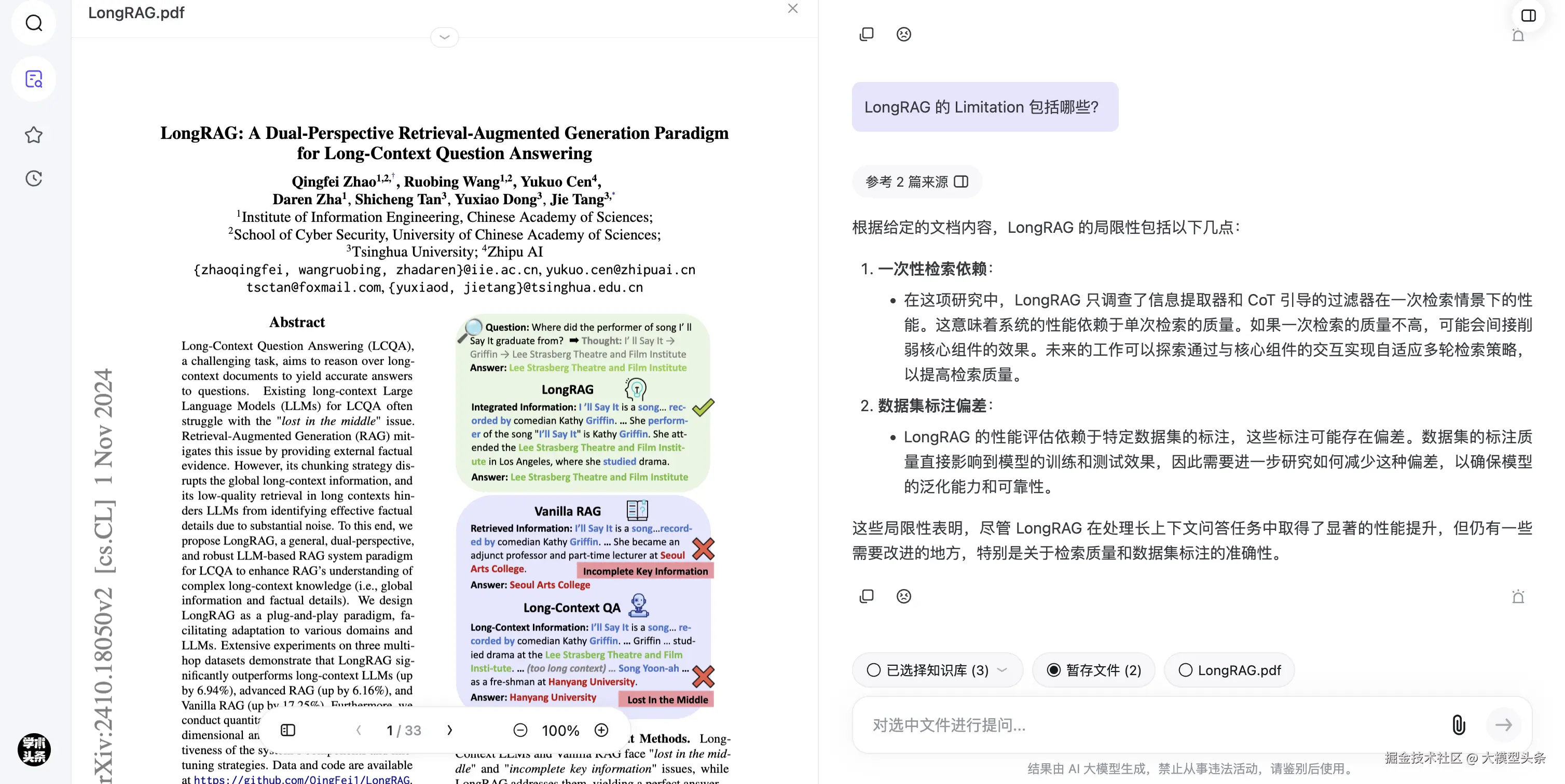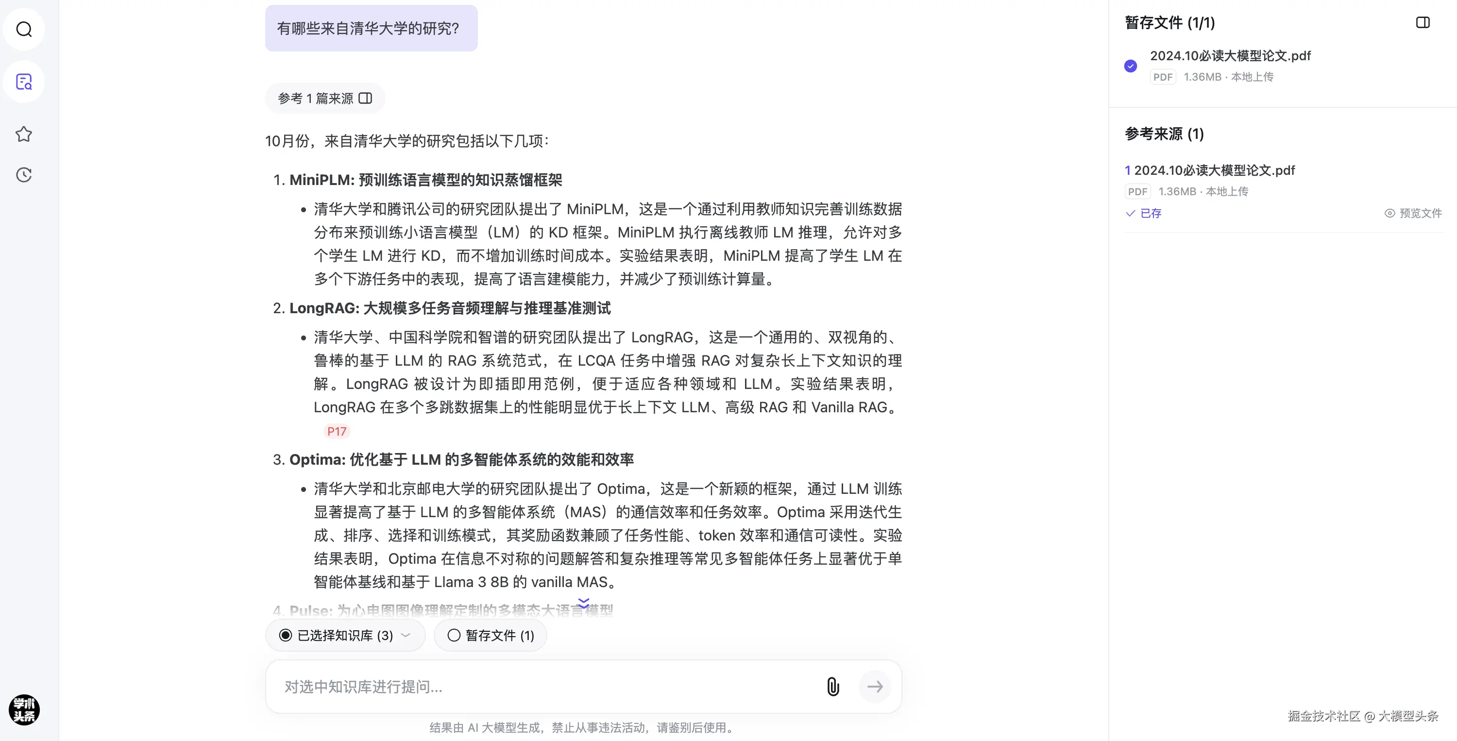 例如,我们上传了「2024.10必读大模型论文」PDF 文档,让知乎直答「专业搜索」总结这个文档内有哪些来自清华大学的研究。如下图,它也能很好地把相关内容摘录出来并做整理。