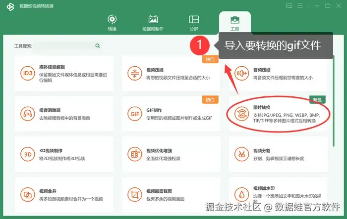 数据 蛙视频转换器不仅支持音视频格式的转换,还能处理图片格式转换。用户可以用数据 蛙实现gif转png。软件界面简洁明了,操作引导清晰,对用户十分友好。该视频转换器支持广泛的图片格式转换,包括GIF、JPG、PNG、BMP等。这使得用户可以根据需要轻松地将图片转换为所需的格式。