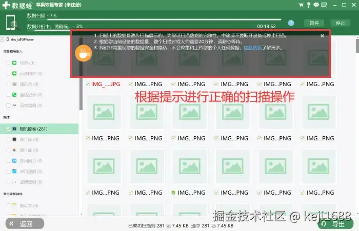 第二步:扫描过程中,请根据软件的提示进行操作,软件会保护您的数据安全和隐私,也不会覆盖你手机上现有的数据。