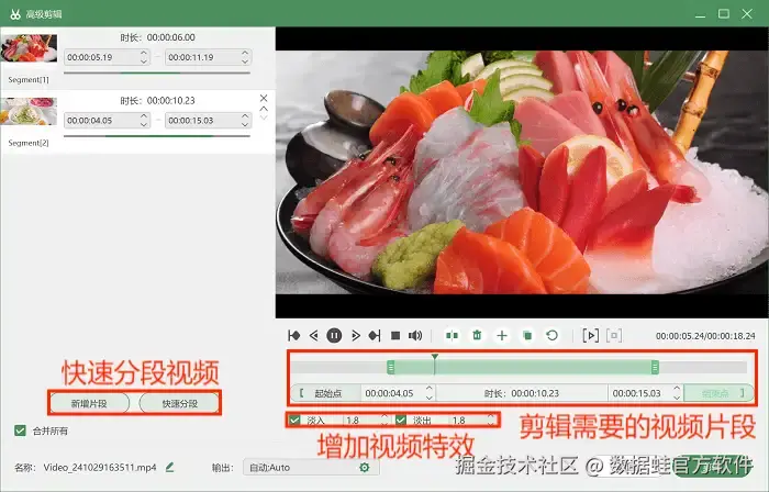 步骤3: 录制完成后,可以使用软件内置的后期编辑工具 “高级剪辑” 对视频进行后期编辑操作。如快速分段视频、增加视频特效等。