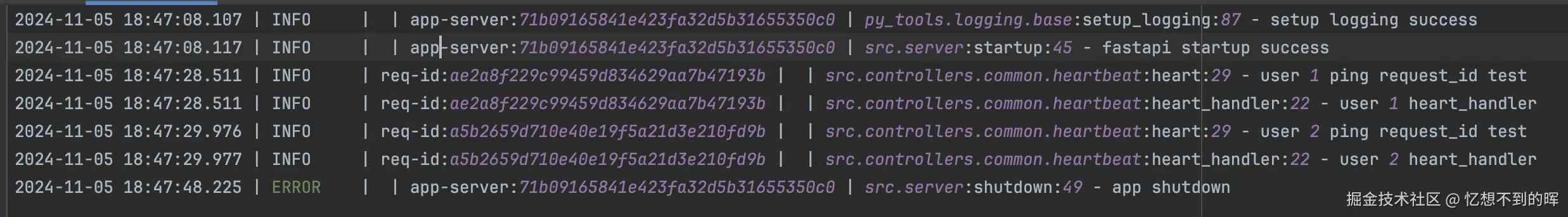 这里 TraceUtil.set_trace_id(title="app-server") 在项目启动的时候设置了一个 trace_id 用来记录服务的启动与结束信息。