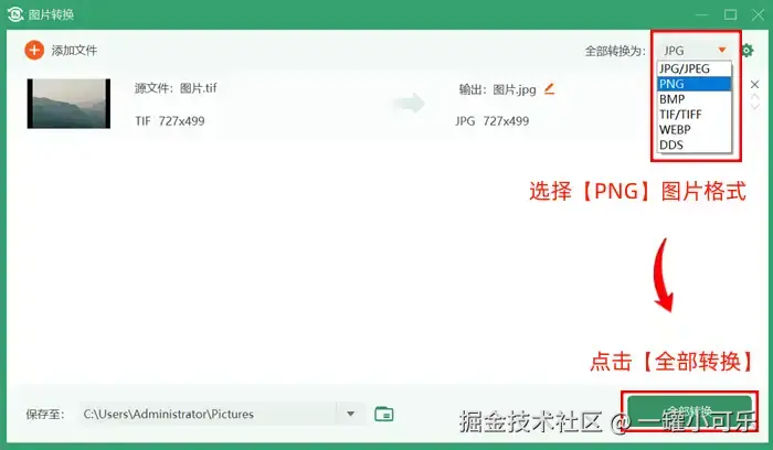步骤3:进入图片格式转换界面,下拉选择需要转换的【PNG】图片格式,再点击【全部转换】即可。