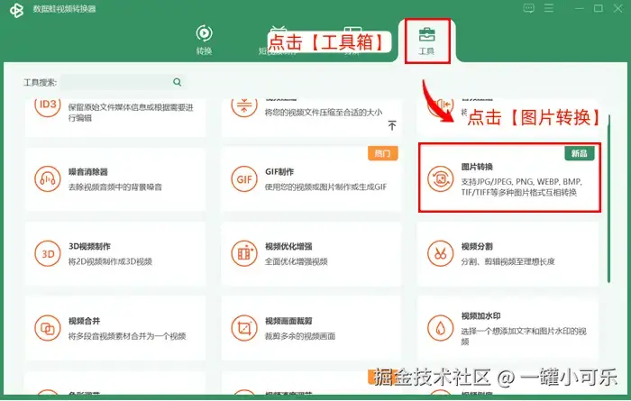 步骤1:运行数据 蛙视频转换器,在【工具箱】中找到其新开发的功能【图片转换】,然后点击进入即可。