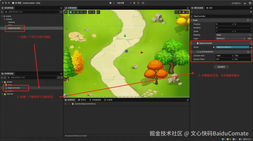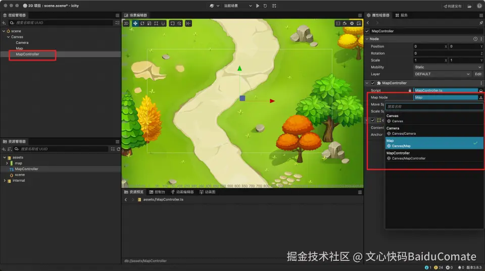 接着回到场景编辑器,将地图节点关联到地图控制节点的属性上,该属性就来自脚本中刚定义的MapNode属性。