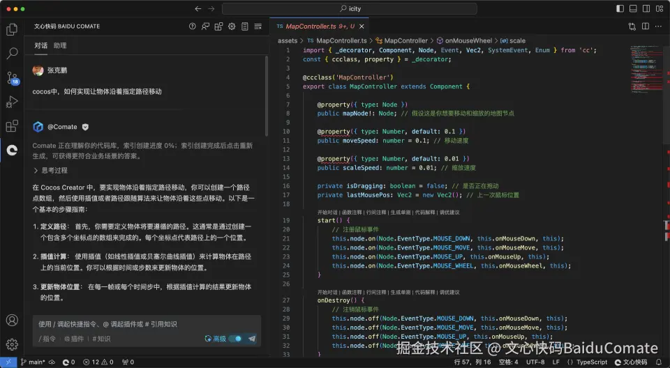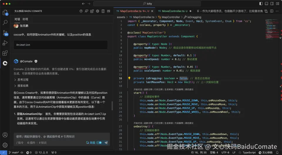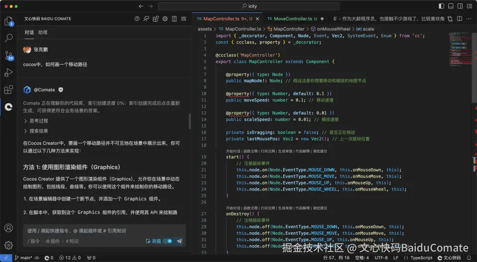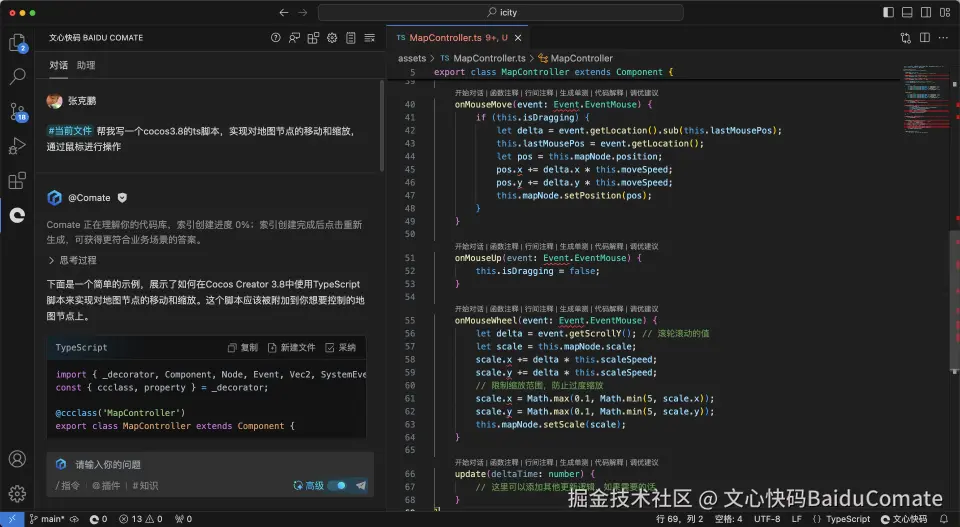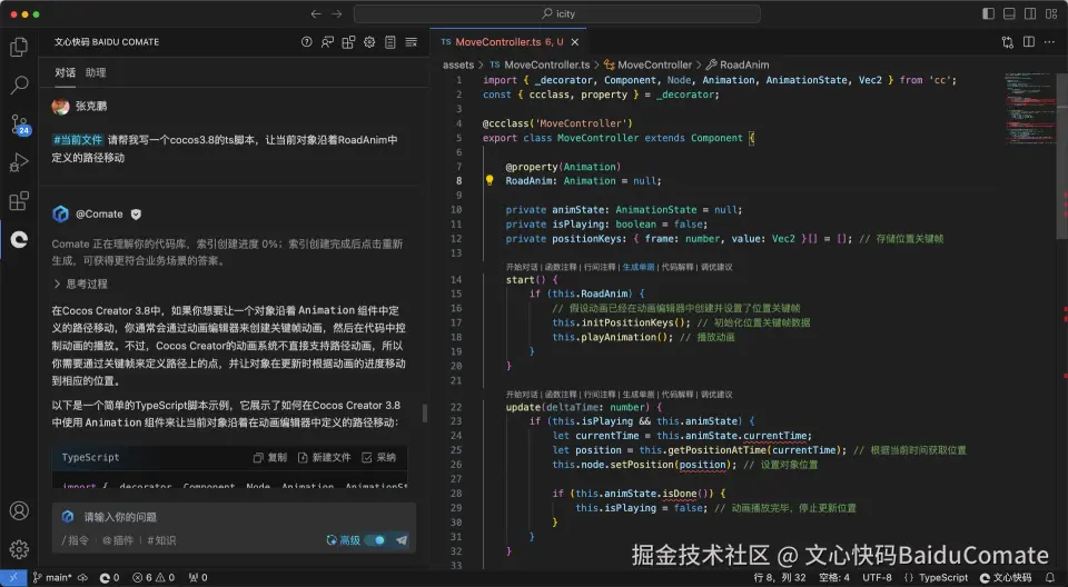 从 Comate 中采纳到文件中后,VS Code 编辑器提示了一些语法错误,不知道是不是少安装了什么其他插件。另外根据Cocos Creator 3.8官方教程的一些示例来看,一些写法也有些区别。可能是版本兼容的问题,先调试着看吧。