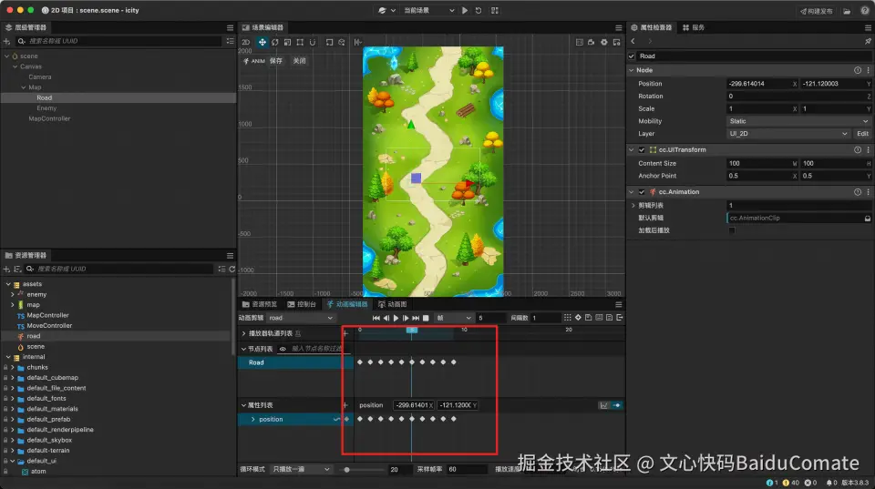3)简单起见,考虑使用方法二,首先定一个动画节点,然后沿着地图的道路通过关键帧来定义移动的坐标