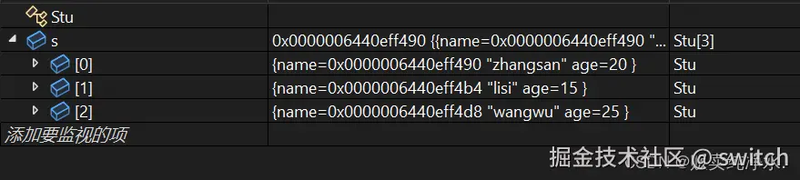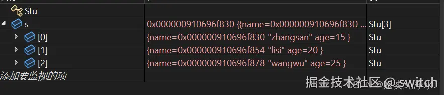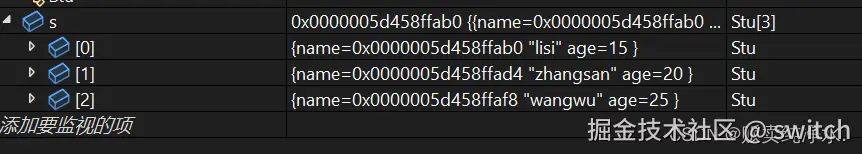 struct Stu s[] = { {"zhangsan",15},{"lisi",20},{"wangwu",25} };