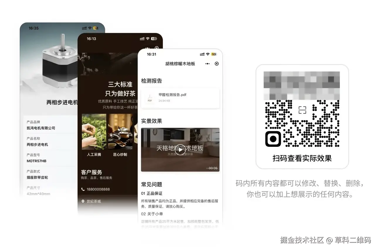 - 方便更新:传统的纸质宣传册和电子画册成本高,更新也不方便。使用二维码进行产品介绍,所有内容都可在草料后台快速更新,不需要复杂的操作。
