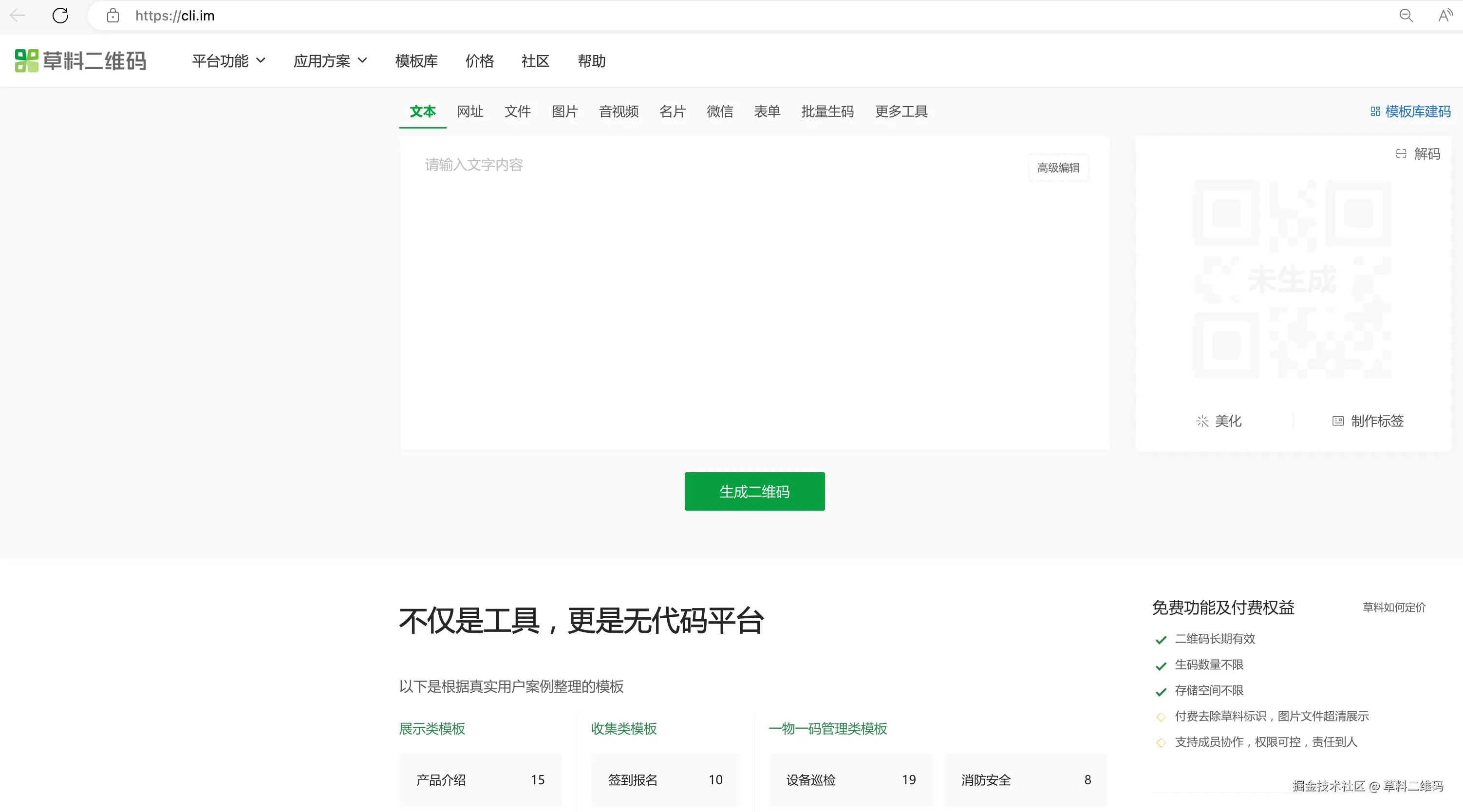 免费使用:二维码长期有效,生码数量、扫码次数都不限