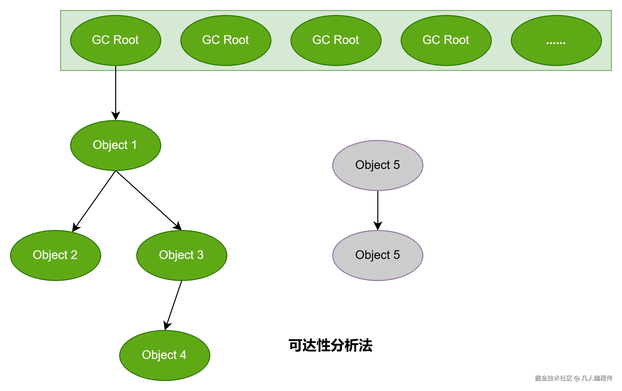 可达性分析法会以GC Roots作为起始点,然后一层一层的去寻找引用的对象,被找到的对象就是存活对象,无法到达的对象就是垃圾对象。