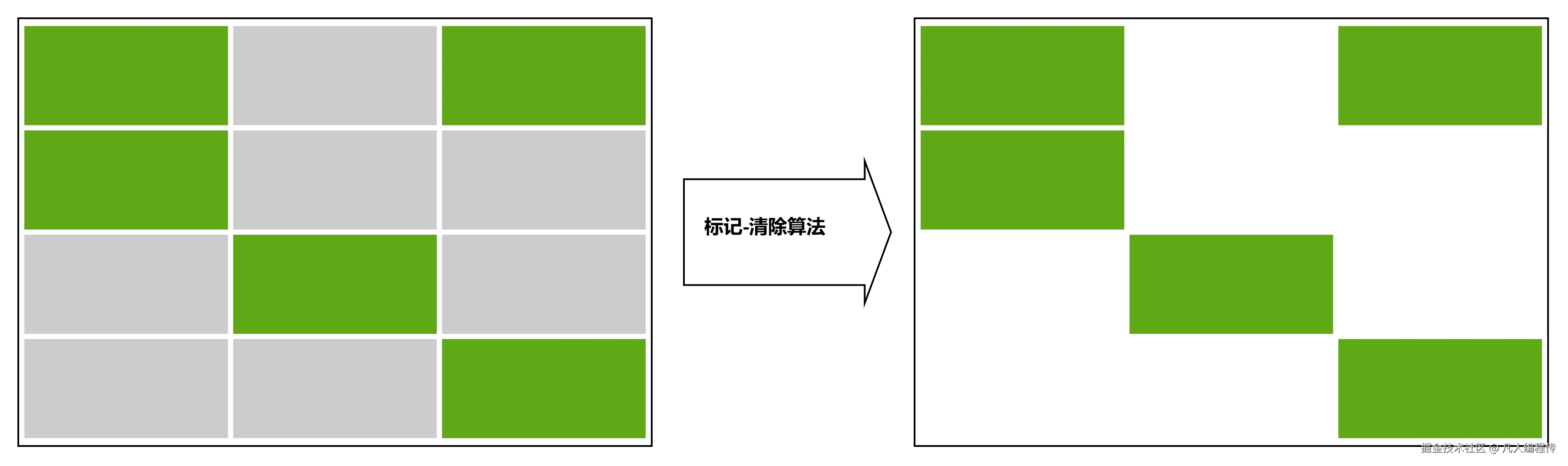 标记-清除算法是一种非常基础的垃圾回收算法,针对某块内存空间,比如新生代、老年代,如果可用内存不足后,就会STW(暂停用户线程的执行),然后执行算法进行垃圾回收: