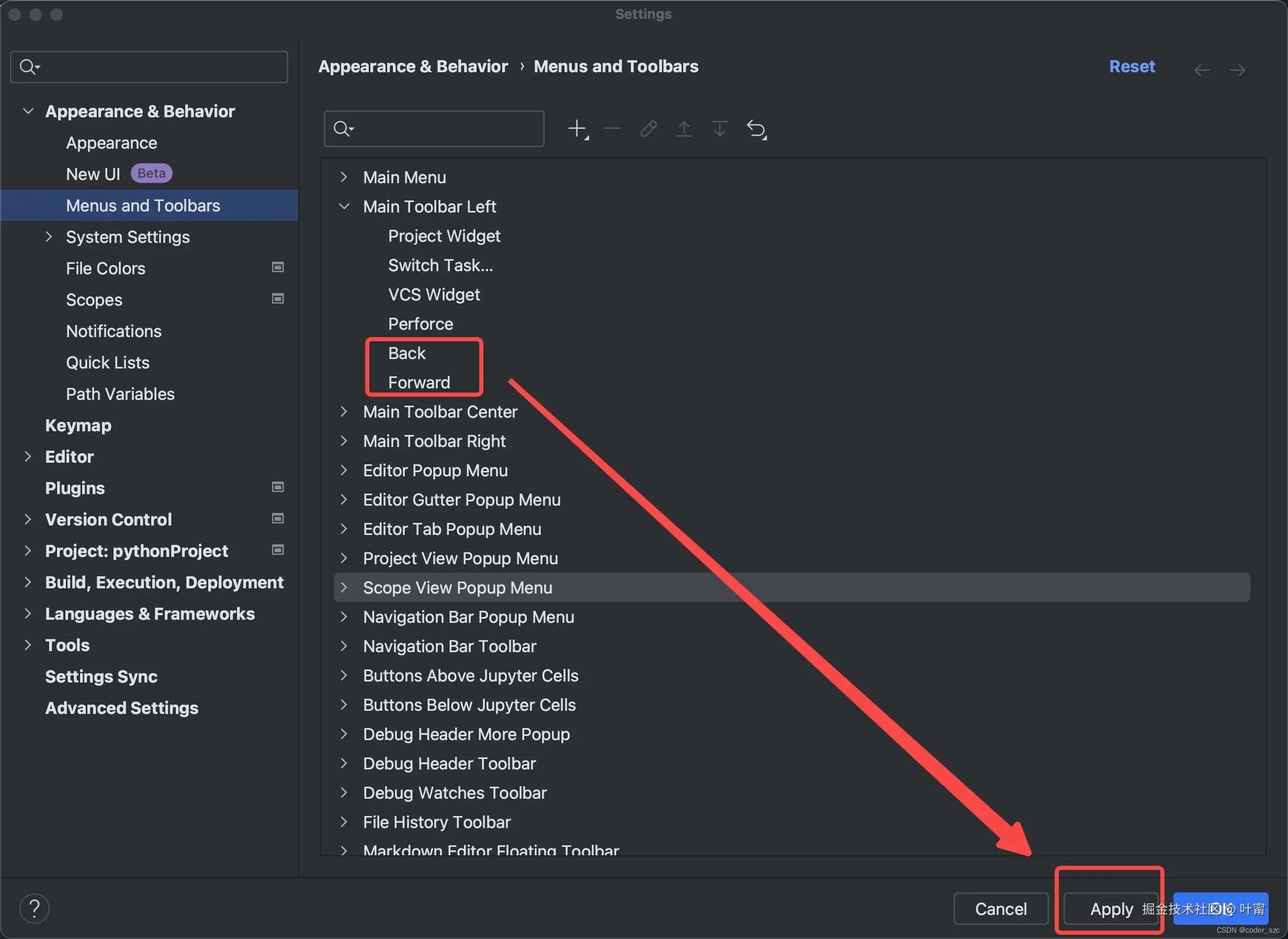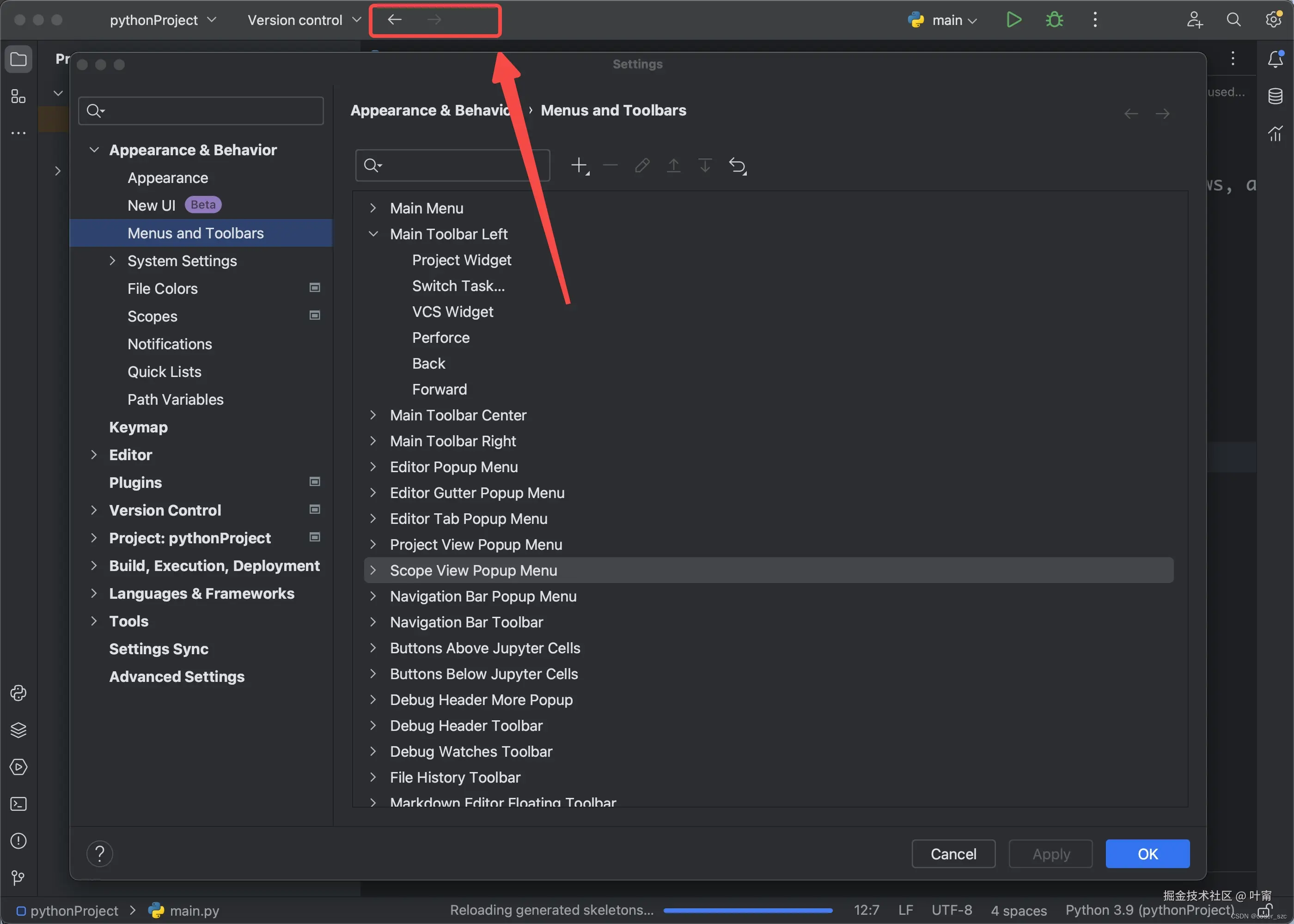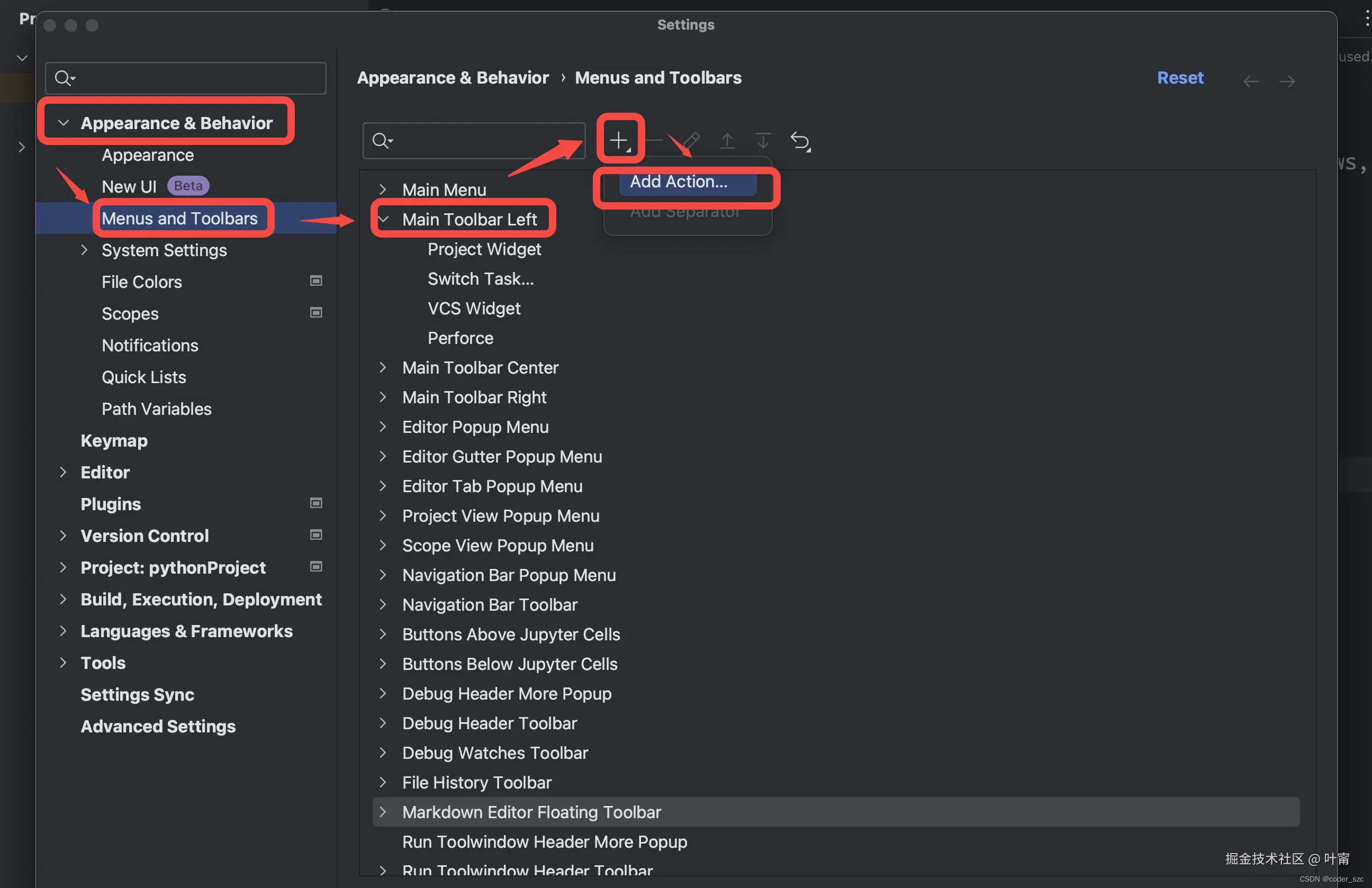 以PyCharm为例,点击左上角PyCharm->Settings进入设置对话框,点击Appearance & Behavior -> Menus and Toolbars,双击Main Toolbar Left,点击右上角+号,选择Add Action: