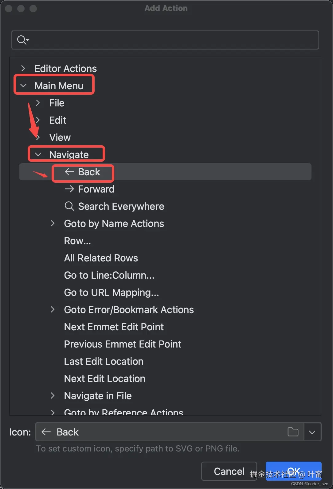 在弹出的对话框里,选择Main Menu -> Navigate,选择其中的Back,点击OK: