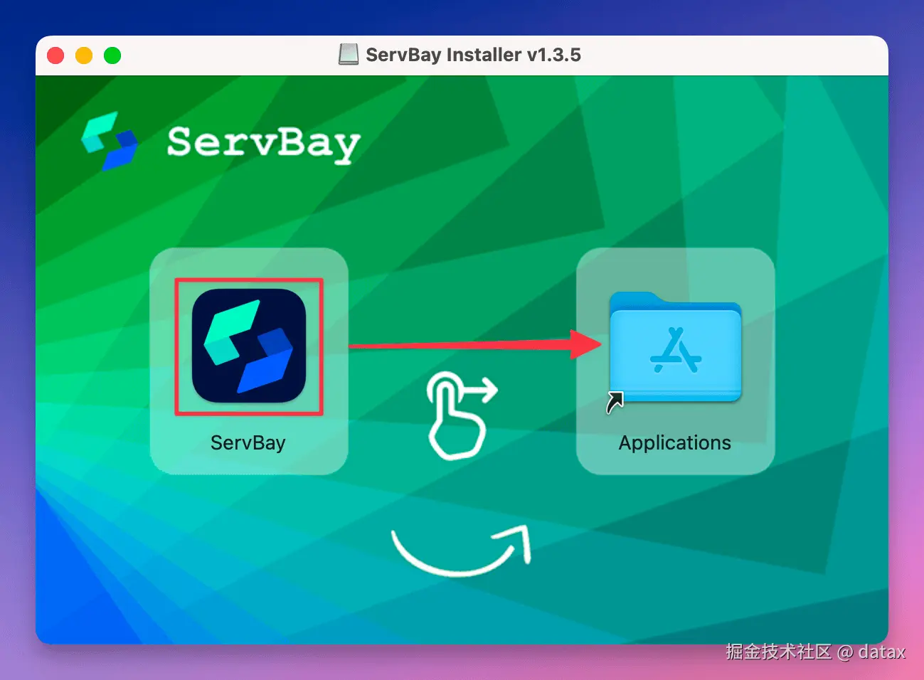 在弹出的窗口中,将 ServBay.app 图标拖到应用程序文件夹。
