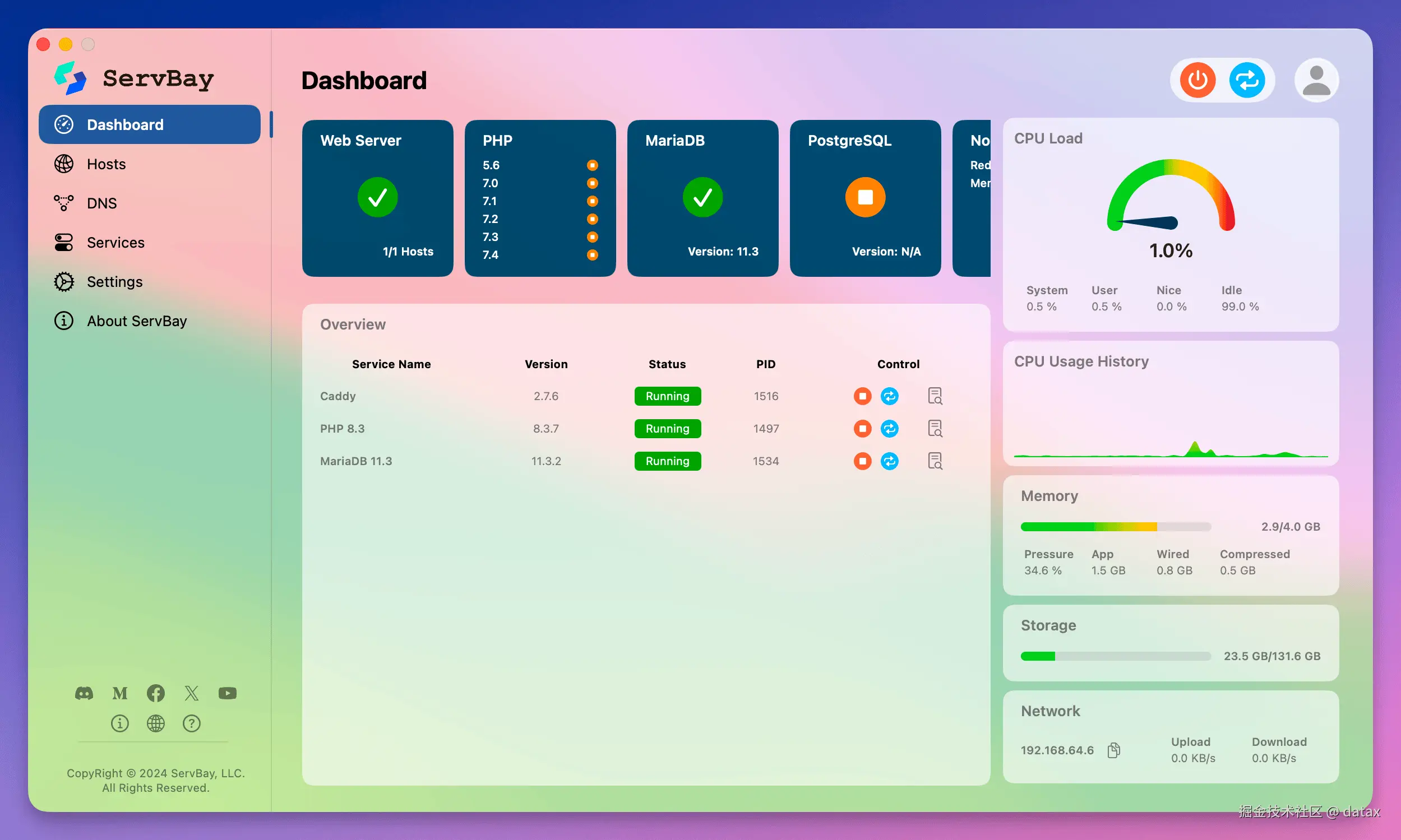 安装完成后,启动ServBay并确认服务正常运行。你可以看到成功后的界面。