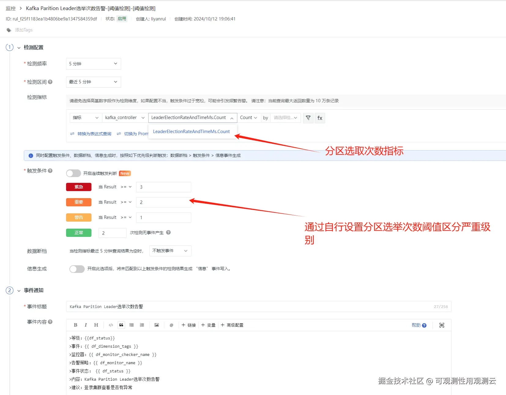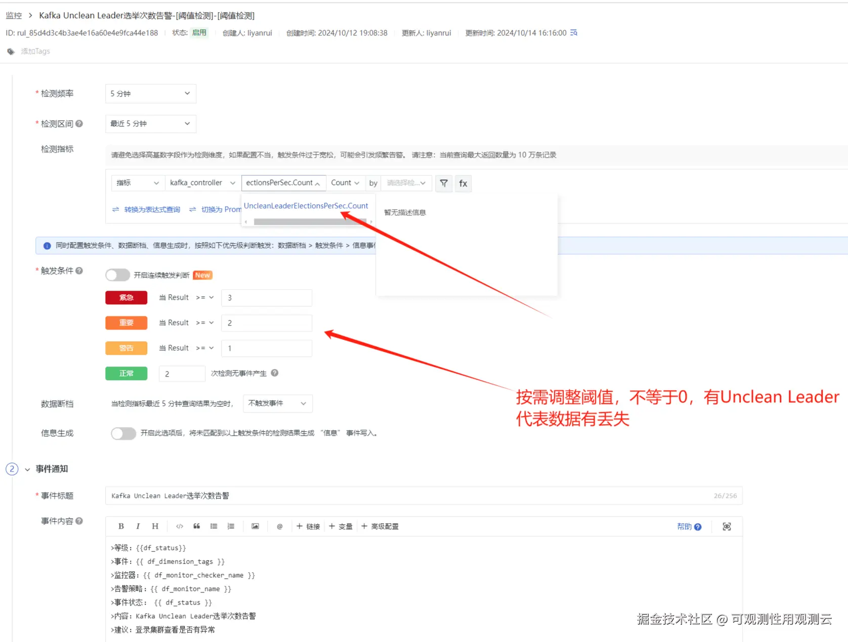 Kafka 分区 leader 选举是 Kafka 高可用性的关键机制之一。当 Kafka 集群中的某个分区的 leader 节点出现问题时,会触发 leader 选举,以确保消息的高可用性和一致性。监控 leader 选举的次数是有必要的,因为这可以帮助你了解集群的健康状况和潜在的问题。频繁的 leader 选举可能表明集群中存在问题,例如硬件故障、网络问题或者 Kafka 配置不当。在某些情况下,频繁的 leader 选举可能会导致集群性能下降,因为选举过程需要额外的资源和时间。因此,通过设置 LeaderElectionRateAndTimeMs.Count 告警来监控 leader 选举的次数可以帮助及时发现并解决这些问题。