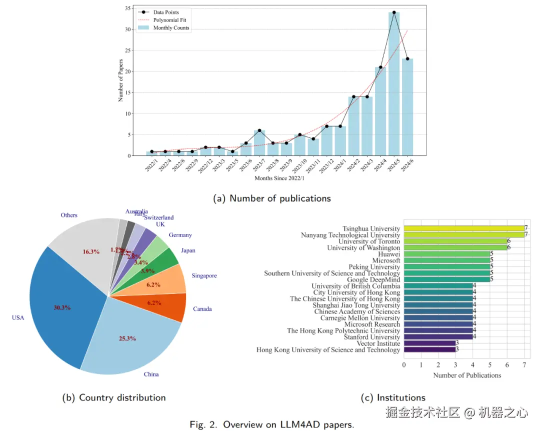 图中还显示了在 LLM4AD 出版物中领先的机构及其所在国家。美国领先,紧随其后的是中国,这两个国家单独占据了 50%的出版物。接下来的八个国家,包括新加坡、加拿大和日本,共同贡献了总出版物的三分之一。发表最多论文的研究机构包括清华大学、南洋理工大学和多伦多大学等知名大学,以及华为、微软和谷歌等大型公司。这种分布强调了研究主题的广泛兴趣和它们在现实世界中的实际应用的重大相关性。