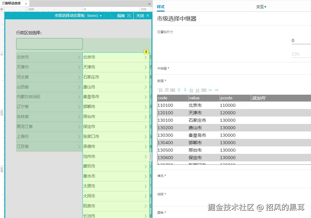 省级选择中继器包括code、value两列,市级/区级选择中继器包括code、value、pcode三列,code为省份编码(关联市级选项使用),value为显示名称,pcode为上级行政区划编码;