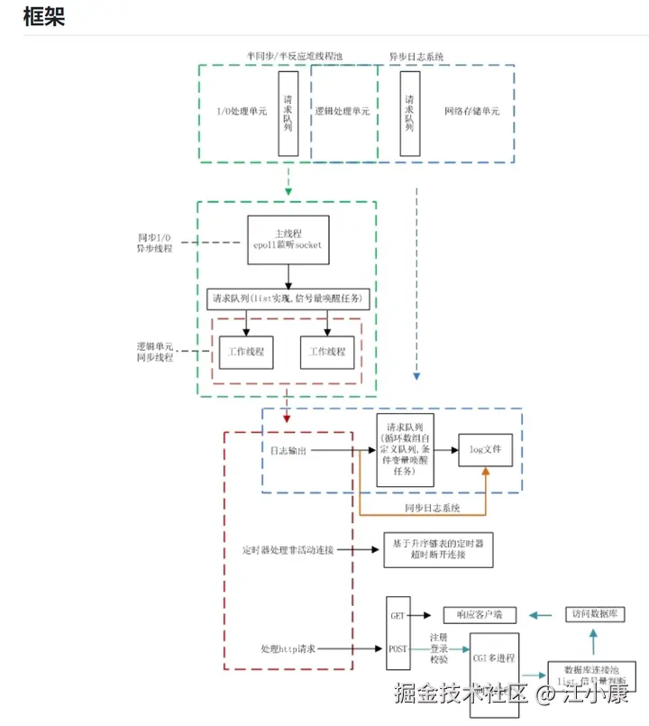 epoll等),适应不同的系统环境和性能需求,展示了对网络编程中 I/O 多路复用的掌握。 - Reactor 事件处理机制:采用 Reactor 模式进行事件管理,使得框架能够异步处理大量并发请求,适合高并发服务器的需求。