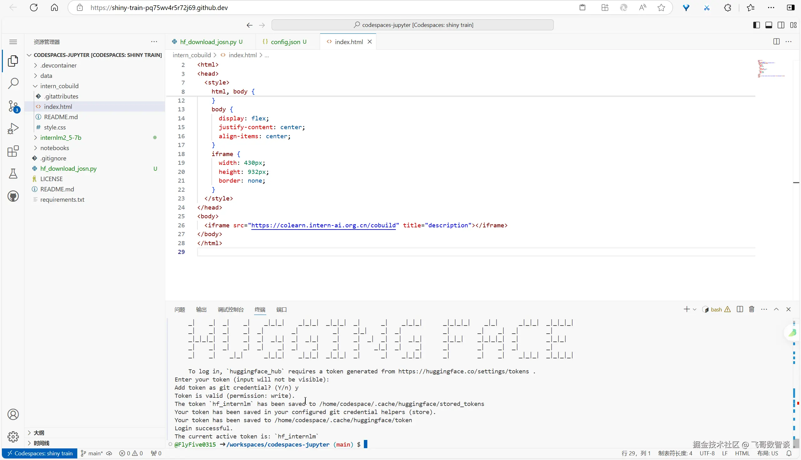 - 然后将“任务一”中的config.json复制到CodeSpace的intern_study_L0_4文件夹中
