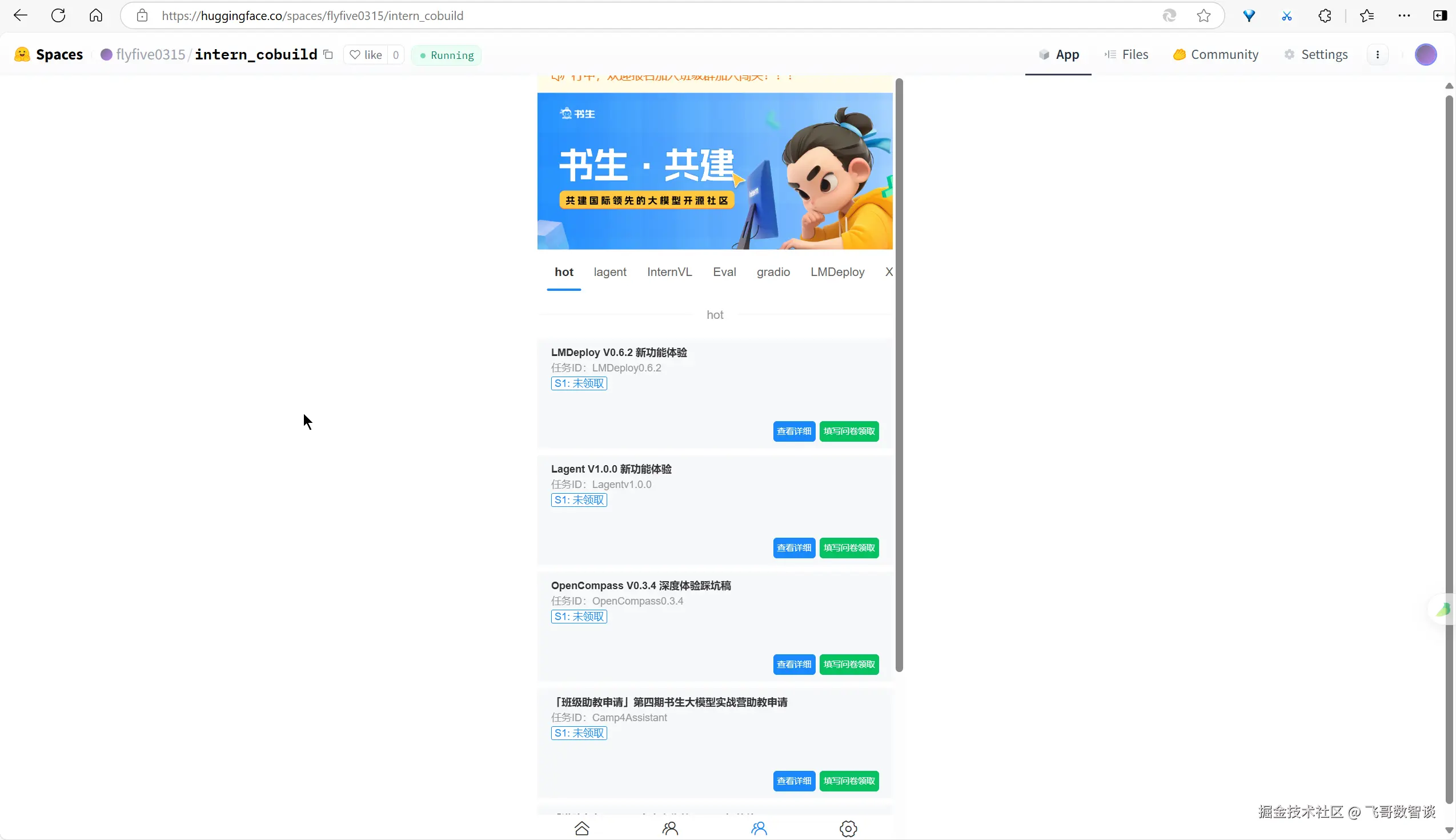 目标:在Hugging Face平台上使用Spaces并把 intern_cobuild 部署成功,关键步骤截图。