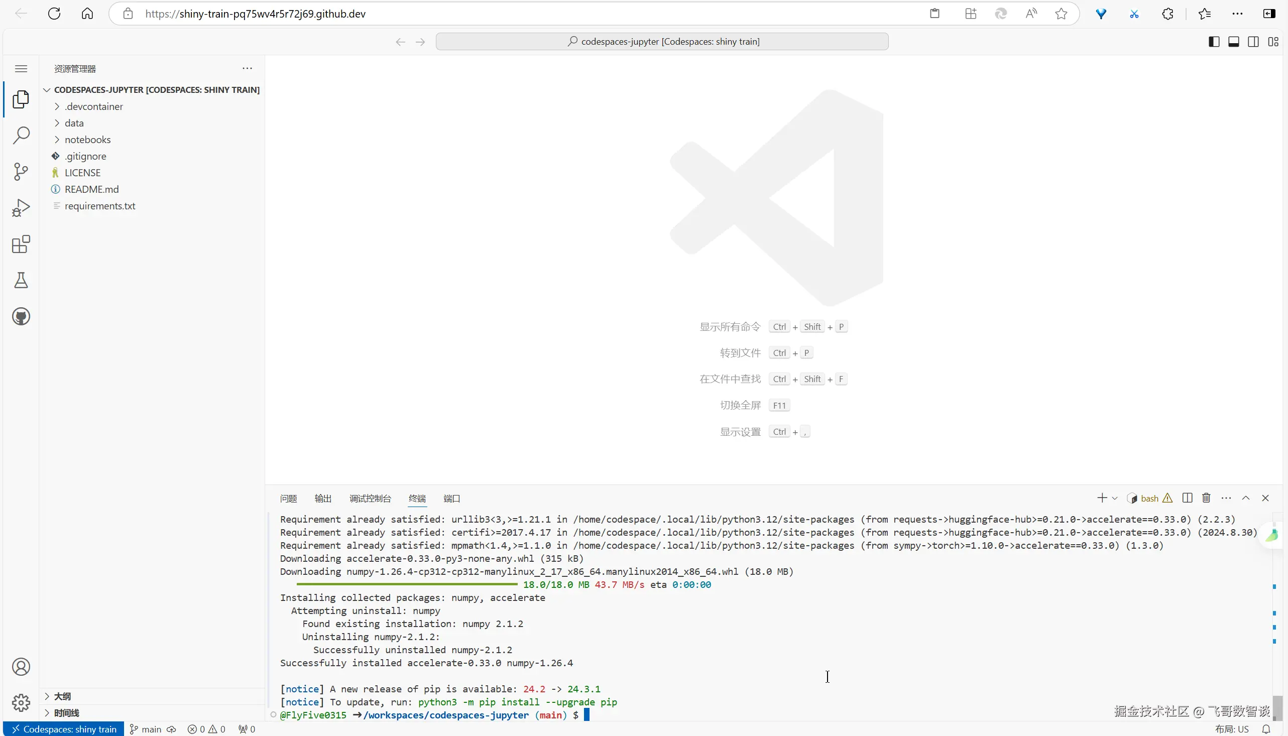 - 打开 GitHub CodeSpace , 创建Jupyter Notebook环境,类似网页版VSCode。