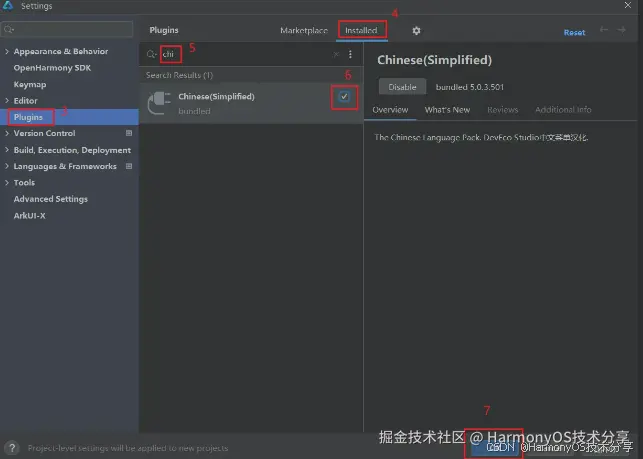 Customize → All settings... → Plugins → Installed -- 搜索 Chinese → 勾选 → OK → Restart