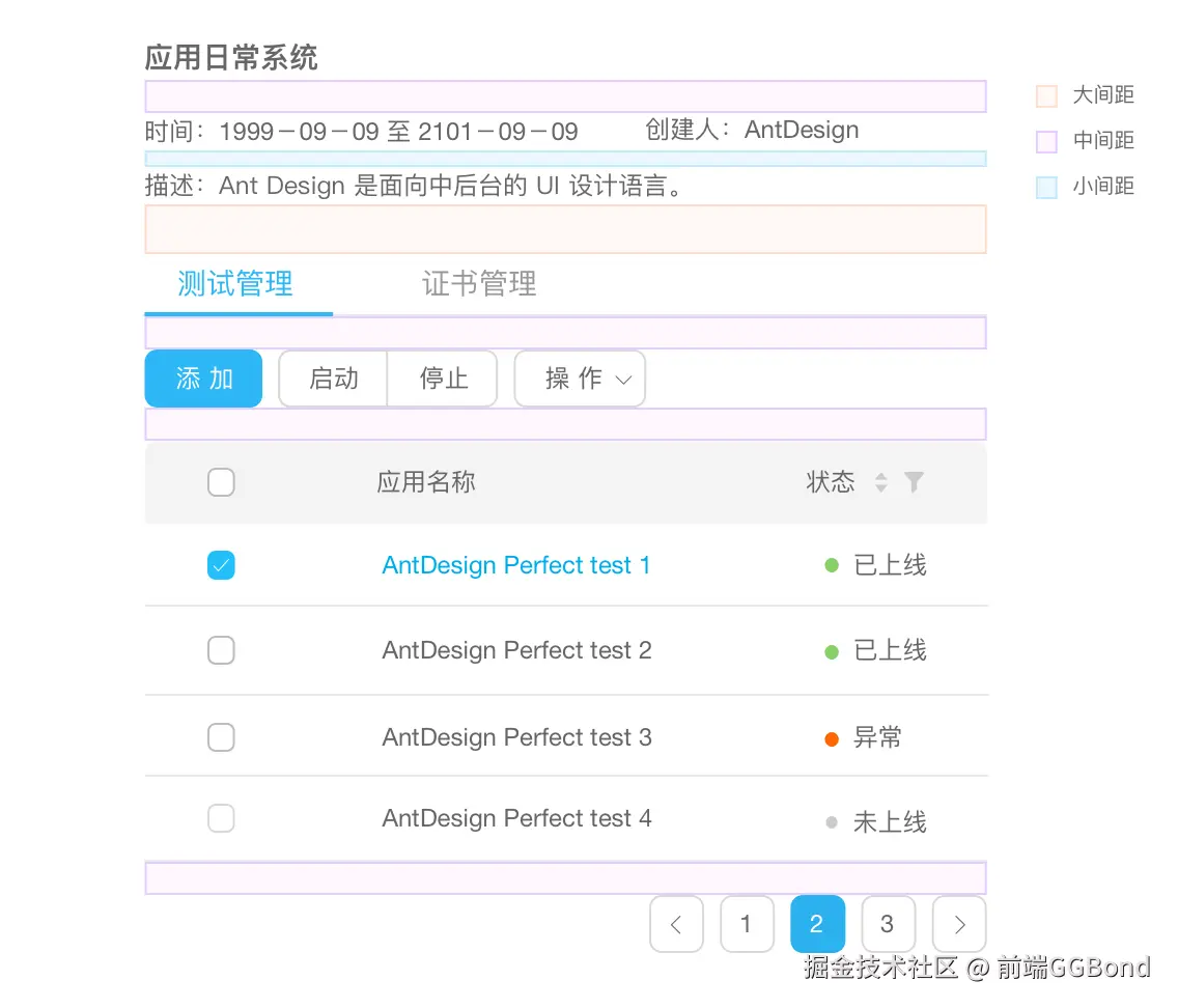 通过8px『小号间距』、16px『中号间距』、24px『大号间距』这三种规格来划分信息层次;在 Ant Design 中,y=8+8*n。其中,n>=0,y 是纵向间距,8 是『基础间距』。