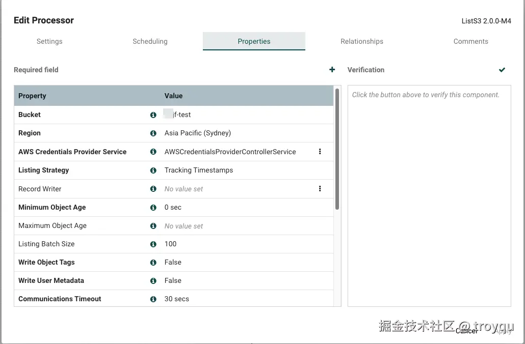 配置拉取s3 object配置复用Lists3Aws credentials service服务进行认证,bucket等其他属性使用默认值从lists3 processor的attribute中获取。