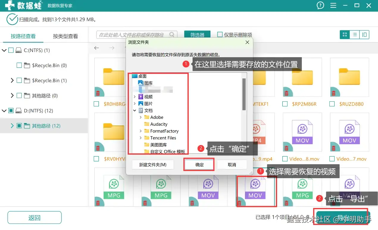 第3步: 选中需要恢复的视频后,点击“导出”,然后在弹窗里选择恢复视频的存放位置,点击“确定”。