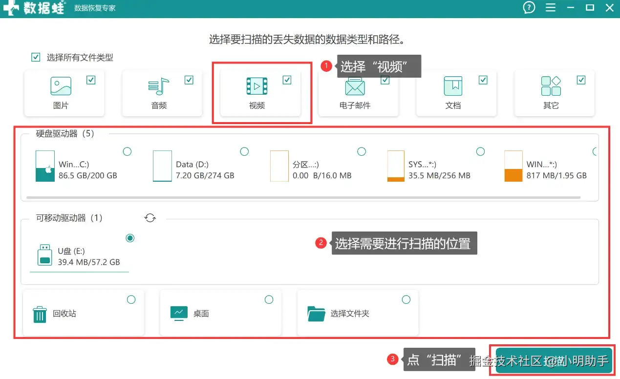 第1步: 打开数据 蛙恢复专家,进入软件的首页后选择需要扫描的文件类型为“视频”,再选择进行扫描的位置,最后点“扫描”。