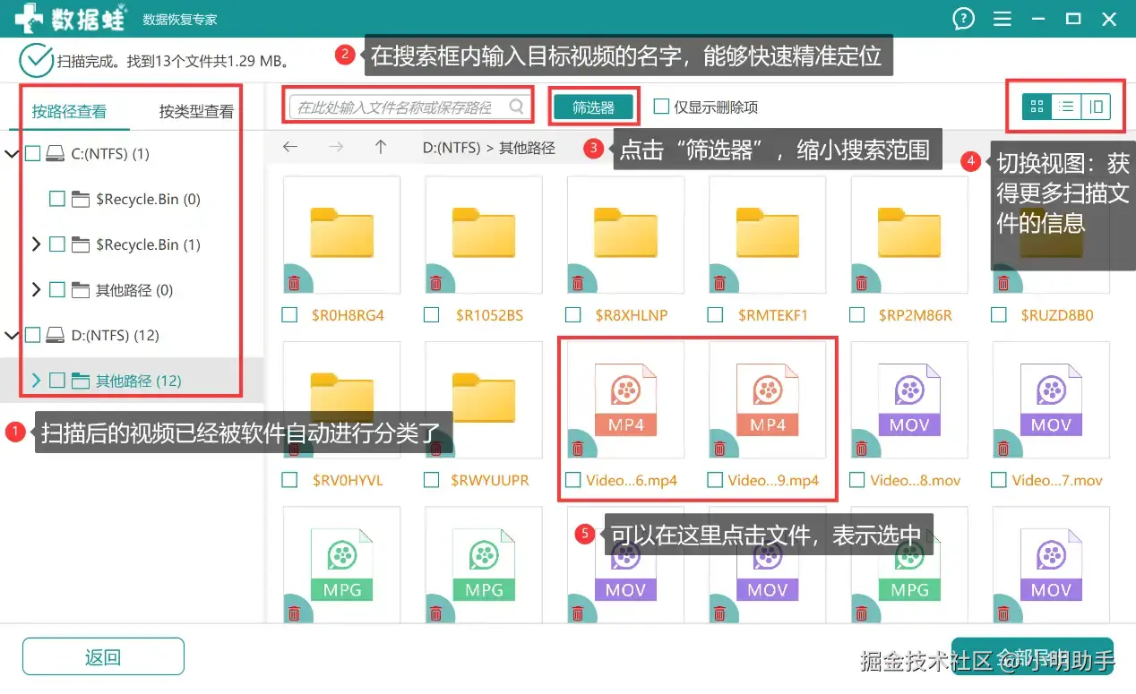 第2步: 扫描完毕后,可以依靠一些工具(如“搜索框”、“筛选器”等)去帮助自己更为快速地找到需要恢复的视频。