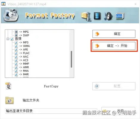 第二步:在左侧的格式选择框中找到并选择自己需要输出的音频格式,然后点击【确定->开始】按钮开始视频转换音频。