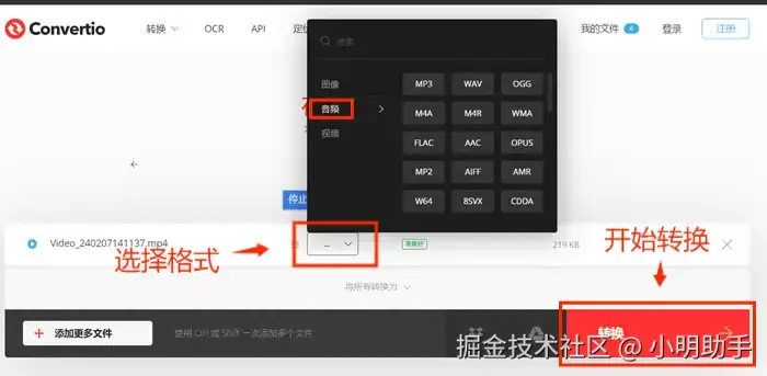 第三步:点击界面中的【···】按钮,选择音频格式,确定格式后,点击右下方的【转换】按钮开始从视频中提取音频。转换完成后,下载提取出的音频文件至本地。