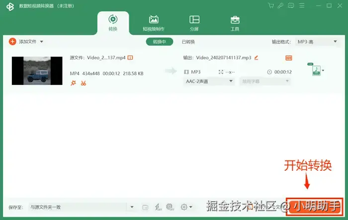 第四步:所有设置确定完成之后,点击右下角的【全部转换】按钮,开始提取视频中的音频。转换完成后,您可以在指定位置找到提取出的音频文件。