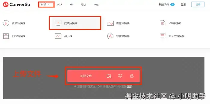 第二步:进入网站首页后,鼠标浮动到左上方的【转换】按钮上,点击下拉列表中的【视频转换器】,然后点击【选择文件】上传您要进行音频提取的视频文件。